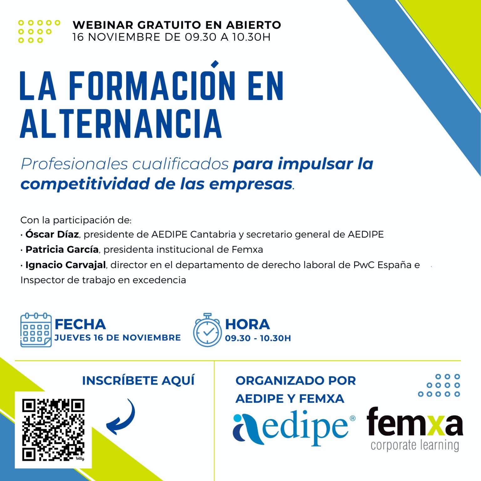 AEDIPE y Femxa organizan el webinar gratuito “La Formación en Alternancia: profesionales cualificados para impulsar la competitividad de las empresas” el próximo 16 de noviembre de 2023 a las 09:30h en formato online. En este encuentro analizaremos los diferentes beneficios que, para la empresa, aporta la adopción de los contratos de formación en alternancia como modalidad contractual complementaria. Además, comentaremos las ventajas económicas y las últimas novedades sobre bonificaciones que entraron en vigor el 1 de septiembre de 2023. El programa será el siguiente: · 09:30 h Apertura institucional a cargo de Óscar Díaz, presidente de AEDIPE Cantabria y Secretario General de AEDIPE. · 09:40 h Ponencia: “Claves y nuevas mejoras en beneficios empresariales de los contratos de formación en alternancia” con Patricia García, presidenta institucional de Femxa. · 10:05 h Ponencia: “Aspectos jurídicos y legales de los contratos de formación en alternancia” de la mano de Ignacio Carvajal, director en el departamento de derecho laboral de PwC España e Inspector de trabajo en excedencia. · 10:20 h Turno de preguntas 10:30 h Fin de la jornada ¡No te lo pierdas e inscríbete ya! |
