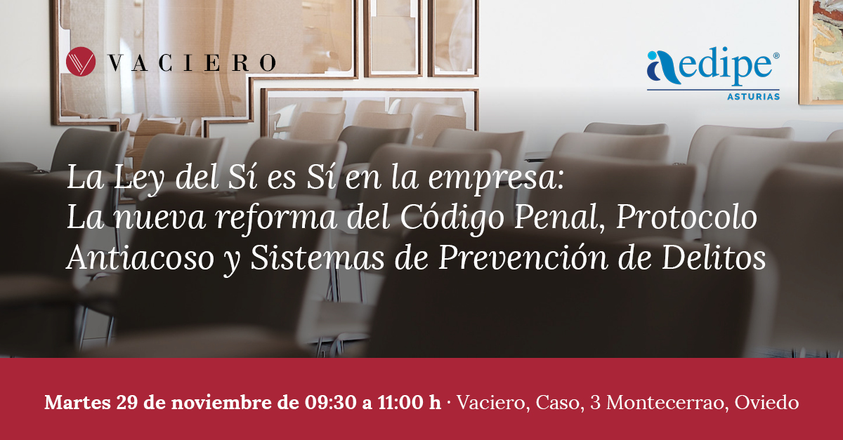 Vaciero y AEDIPE Asturias organizan el evento: La Ley del Sí es Sí en la empresa: La nueva reforma del Código Penal, Protocolo Antiacoso y Sistemas de Prevención de Delitos